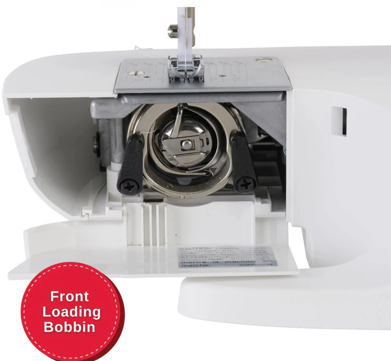 Grâce à la conception de la canette à chargement frontal, les canettes sont faciles à enrouler et à insérer, tout en conservant une surface de plaque à aiguille lisse.