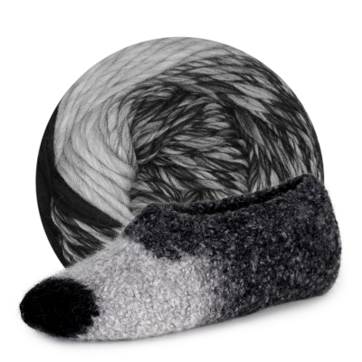 Avec Slipper, vous pouvez tricoter une paire de chaussons assortis à partir d'une seule pelote de laine. Chaque pelote contient deux répétitions d'une transition de couleur qui crée un contraste entre la pointe et le pied, suivies d'un mélange des deux nuances pour le talon et le revers. Une fois les chaussons terminés, il suffit de les feutrer dans la machine à laver pour obtenir une paire parfaite.