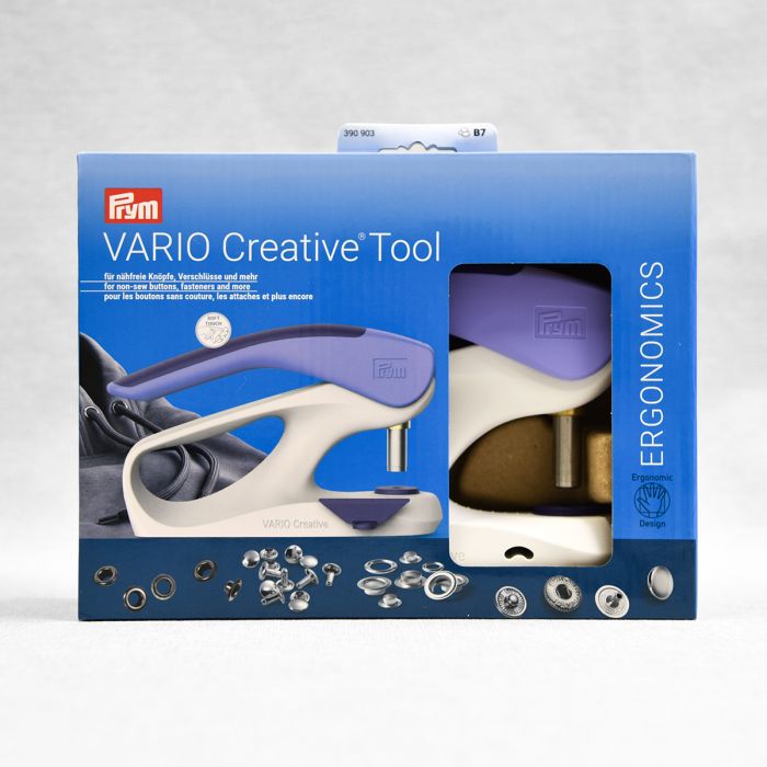 Décorer un jean avec des rivets, poser des boutons pression sur des vêtements pour bébé ou encore percer un coton ouaté et y ajouter des œillets afin de faire passer un cordon de capuche : le VARIO Creative Tool vous permet d’utiliser les nombreux produits sans couture de Prym facilement et sans effort. Grâce à la poignée ergonomique avec surface soft touch, le levier de force du VARIO Creative Tool est agréable au toucher et ne glisse pas dans la main. La mesure longitudinale et transversale, les pieds en plastique assurant une bonne stabilité et la possibilité d’ajuster finement la transmission de force permettent un travail précis, sans fatigue et ne requérant que peu d’efforts. Percer un trou est très facile : ouvrir le levier de force, insérer les outils préperçage et positionner le tissu. Abaisser ensuite le levier de force, préparer le tissu et le percer. Pratique : des outils préperçage de différentes tailles sont déjà inclus. De plus, le VARIO Creative Tool est compatible avec tous les jeux d’outils et les produits de la gamme Prym sans couture, faisant de cet outil une alternative confortable à la pince à boutons pression, à trous et à œillets VARIO. La fixation sur table disponible séparément apporte une stabilité supplémentaire. Le VARIO Creative Tool attirera tous les regards sur la table de travaux manuels. Vous trouverez forcément un outil qui vous plaît !