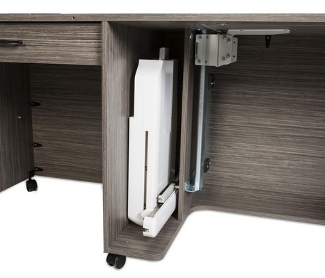 L'élévateur a 3 positions - tout en bas, la position intermédiaire pour la couture et la courtepointe où le bras de votre machine à coudre est au même niveau que le dessus de l'armoire. Très ergonomique et confortable, elle est conçue pour être utilisée avec un insertion de machine à coudre en plexiglas (en option) qui s'adapte autour du bras de votre machine - et enfin, la position tout en haut pour profiter du bras libre de votre machine à coudre et utiliser votre unité de broderie.