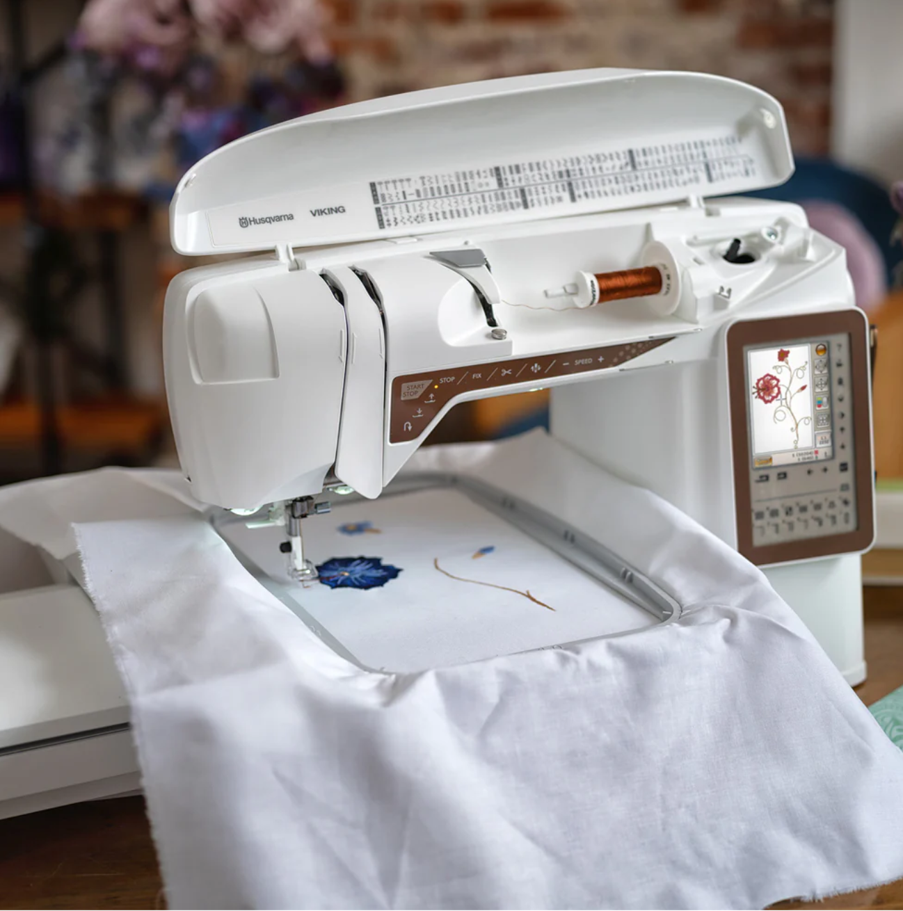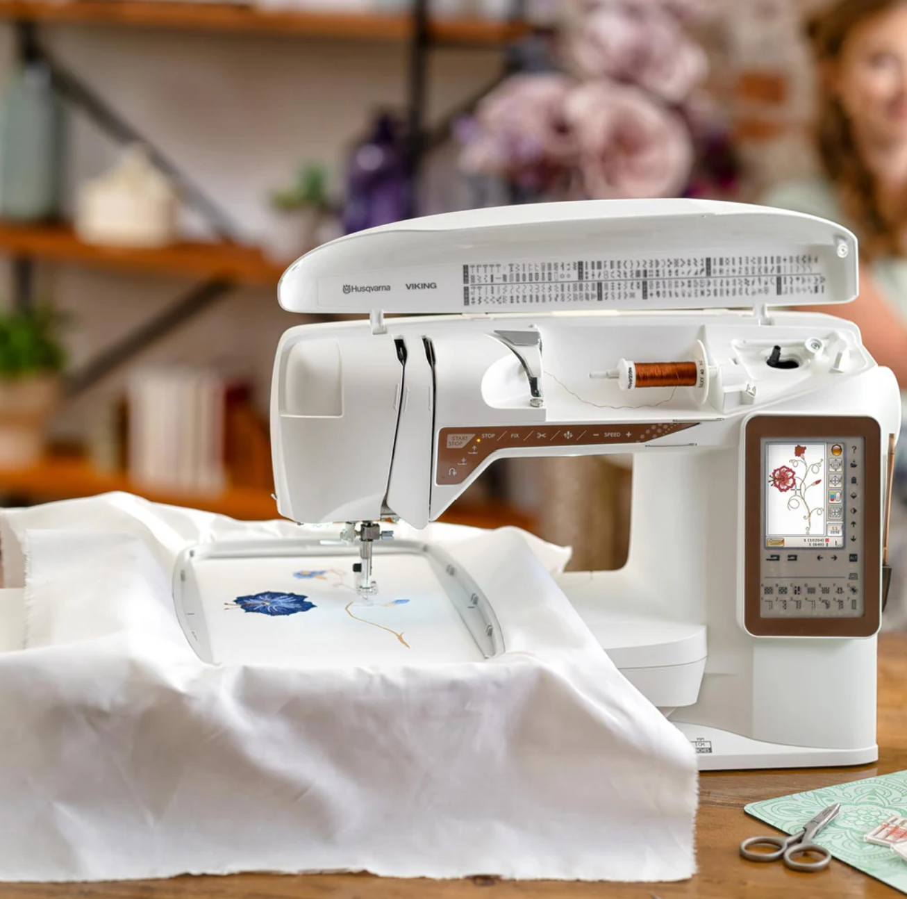Color touch screen: The color touch screen allows you to intuitively navigate through the various embroidery, editing, and sewing screens.