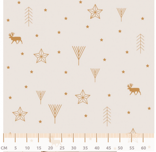 Toile 100 % coton, portant des étoiles, des arbres et des rennes dorés sur fond écru. Le tissu parfait pour décorer la maison pour Noël. Coussins, nappes, chemins de table et serviettes, pour un Noël fait main!