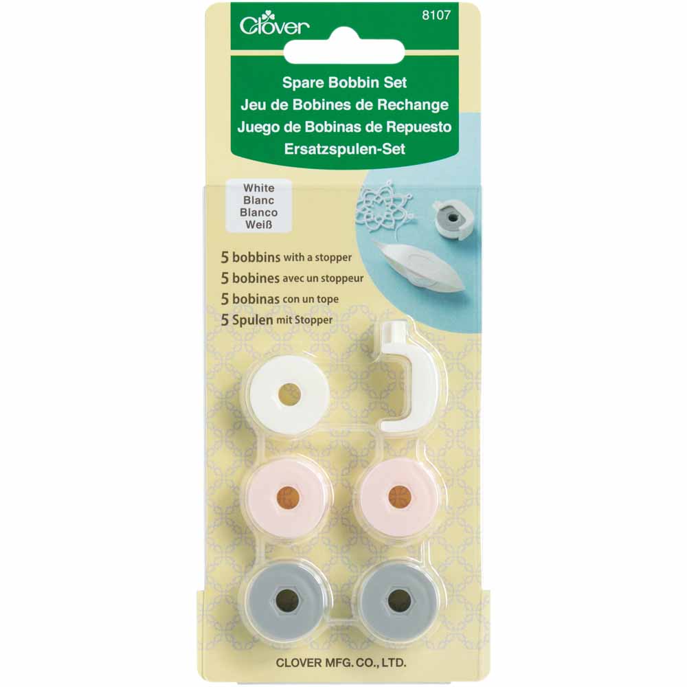 Spare Bobbin Sets are for exclusive use with Clover Bobbin Tatting Shuttles. Package includes five bobbins and one stopper.